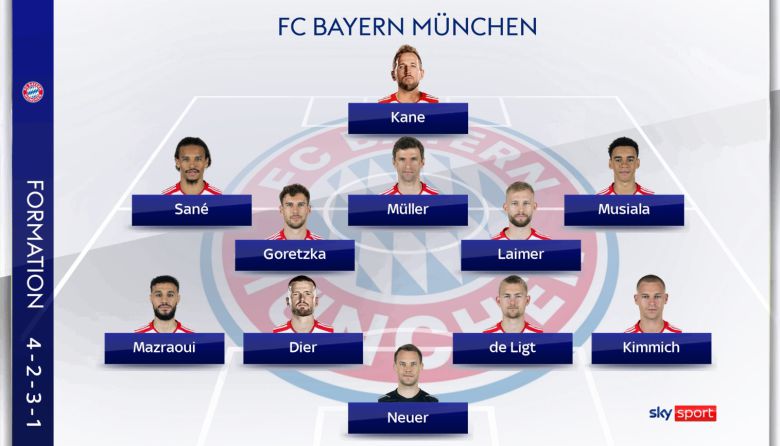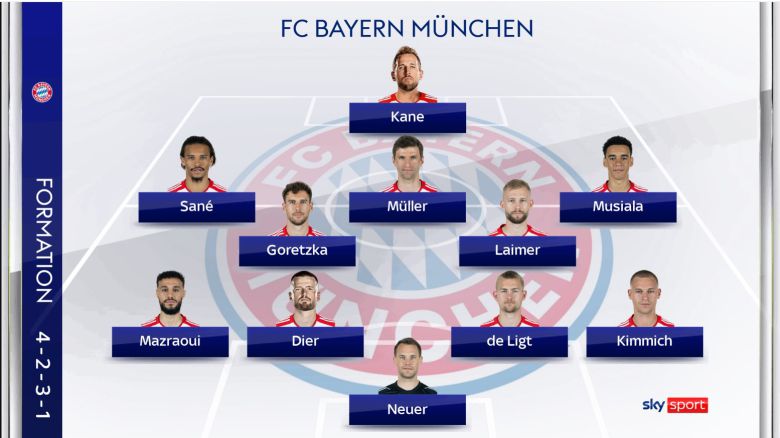 3선은 레온 고레츠카와 콘라트 라이머가 지키고, 2선에 레로이 자네, 토마스 뮐러, 자말 무시알라가 배치. 최전방 원콥 자리에 월드 클래스 공격수 해리 케인을 놓았다.