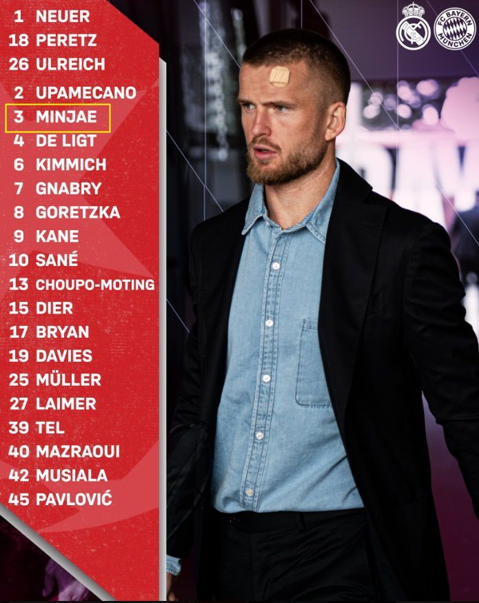 지난 4일 슈투트가르트와의 2023-24시즌 분데스리가 32라운드에서 머리를 다쳐 머리에 반창고를 붙인 에릭 다이어가 메인 모델로 나선 레알 원정 선수단 21인에 등번호 3번인 김민재도 이름을 올렸다.