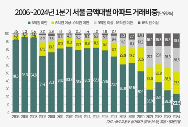 2017년에만 하더라도 6억원 미만 서울 아파트 거래 비중은 70.7%에 달했지만 2018년 60.8%, 2019년 62.5%, 2020년 52.1%, 2021년 28.9%로 하락했다. 이후 2021년 38.1%로 상승했고, 2023년 28.0%로 다시 낮아졌다.
