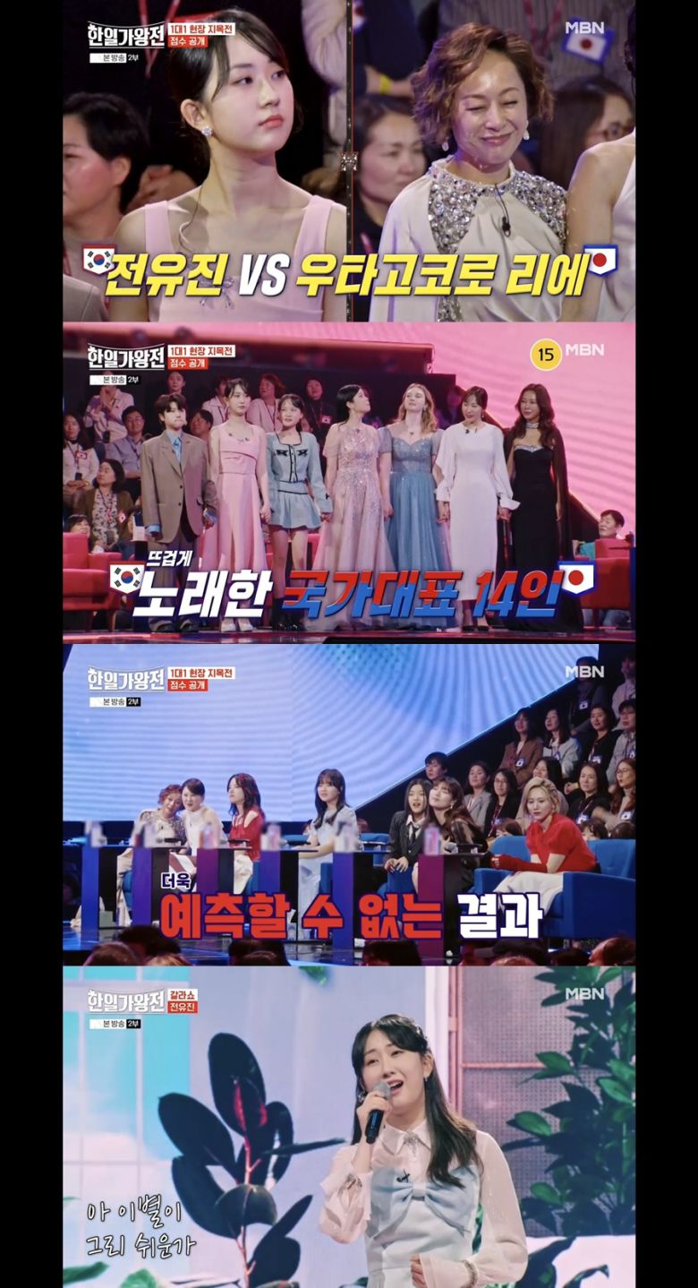 이날 방송에서는 지난주 유일하게 연예인 대표단 점수가 공개되지 않았던 전유진과 우타고코로 리에의 중간 점수가 발표됐다. MC 신동엽도 울컥함을 참기 힘들었다고 밝힌 두 사람 무대의 중간 점수는 70 대 30으로 40점이 높은 전유진이 승기를 가져갔다. 하지만 한일 국민판정단의 점수로 결과는 얼마든지 뒤바뀔 수 있는 터. 중간 점수 집계 결과 한국이 4승 1무 2패를 가져간 가운데 한일 국민판정단의 점수가 더해진 최종 점수가 공개됐다.