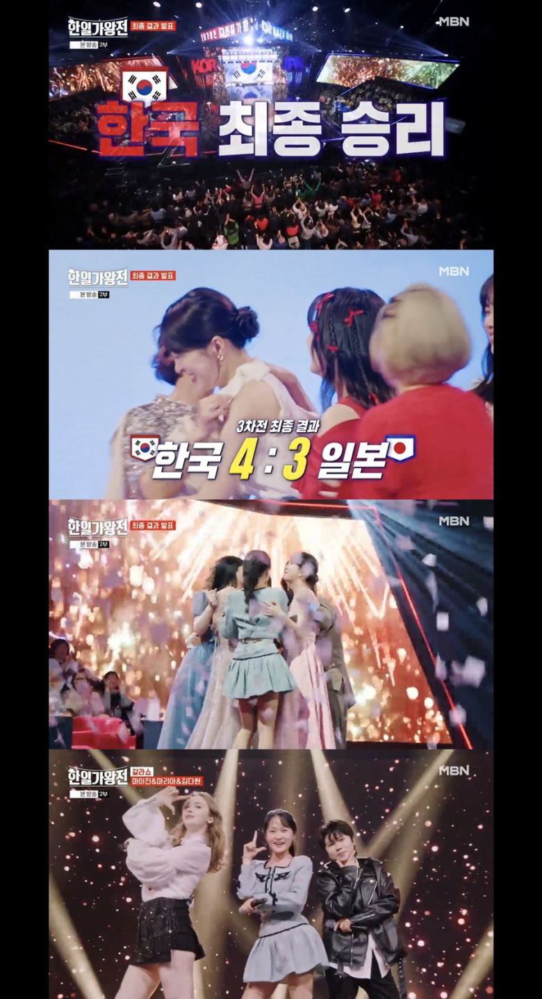 7일 방송된 MBN '한일가왕전' 최종회가 한국팀의 최종 우승을 알리며 6주간 치열하게 진행된 ‘세계 최초 음악 국가대항전’의 뜨거운 마침표를 찍었다.