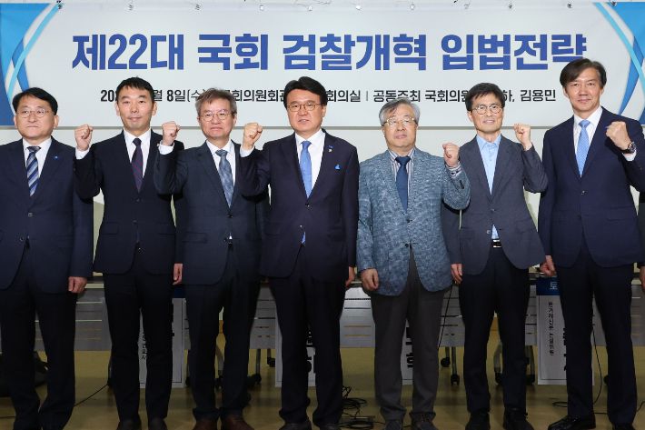 8일 민주당 김용민 원내정책수석과 조국혁신당 황운하 원내대표는 국회 의원회관에서 '제22대 국회 검찰개혁 입법전략 토론회'를 공동주최했다. 현장엔 조국혁신당 조국 대표와 민주당 박찬대 원내대표가 함께 했다.