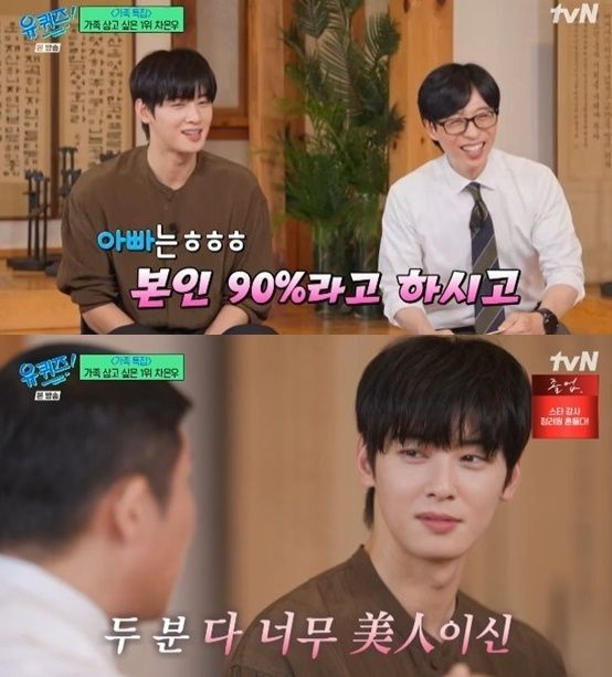 유재석은 차은우의 부모님 이야기를 꺼내며 "두 분 다 닮았겠지만 누굴 더 닮았냐"고 물었고, 차은우는 "아빠는 본인 90%라고 얘기하시고 엄마는 옛날엔 '뭔 소리야'라고 하셨는데 지금은 아무 말 안 하신다"고 답했다.