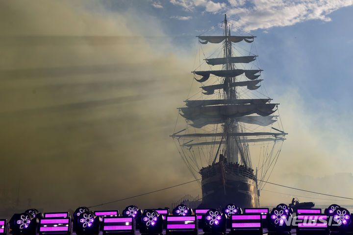 [마르세유=AP/뉴시스] 2024 파리올림픽 성화를 태운 19세기 범선 '벨렘'호가 8일(현지시각) 오전 프랑스 제2 도시 남부 마르세유 항구에 도착하고 있다. 2024.05.09.