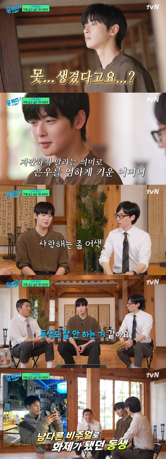 이어 조세호는 "은우 씨는 표현을 좀 하는 편이냐"라고 묻자 차은우는 "은근히 잘 못한다. '엄마 예쁜데', '잘 어울리네' 정도다. 사랑해라는 말은 좀 어색하다. 동생도 표현을 잘 안 하는 거 같다"고 답했다.