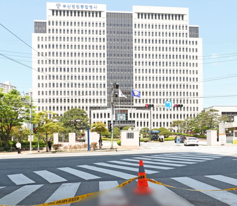 사건이 발생한 부산 연제구 부산지법 앞에 폴리스라인이 쳐져 있다. /뉴스1 |