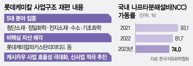 석유화학 위기에 직면한 롯데케미칼(011170)이 첨단소재·정밀화학·전지소재·수소·기초화학 5대 분야로 사업구조를 재편한다. 전략적으로 중요도가 낮은 비핵심 자산은 과감히 처분해 현금 확보에 나선다. 중국의 물량 공세가 거센 범용 석유화학제품에서 고부가가치(스페셜티) 제품으로 무게중심을 이동해 생존을 모색하겠다는 전략이다.