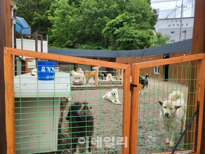유기견 숲의 모습. 박소장은 대형견들이 뛰어놀 수 있는 야외를 제공하고 실내 견사를 직접 지었다고 한다. (사진=박지애 기자) |