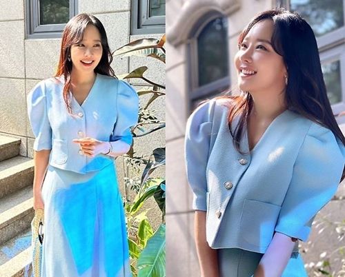 소유진이 하늘색의 짧은 소매와 큰 단추가 특징인 재킷과 허리 라인이 강조된 미디 길이 스커트를 매치한 스타일을 선보였다. 사진=소유진 SNS |