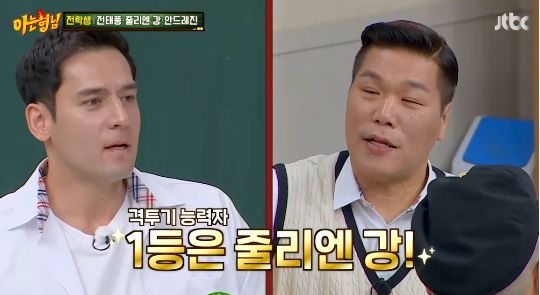 이에 줄리엔강은 “강호동은 얼굴이 커서 어깨가 더 커보이는 것”이라며 “내가 더 크다”라고 말했다.