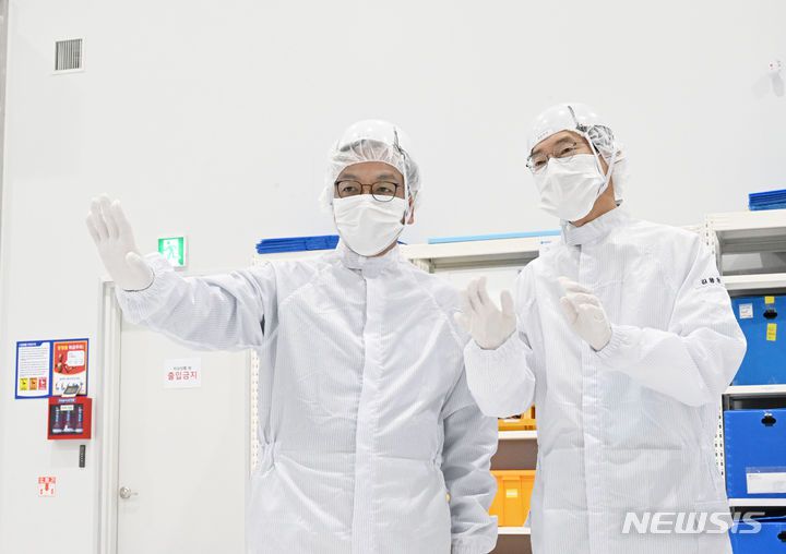 [화성=뉴시스] 최상목 경제부총리 겸 기획재정부 장관이 지난 10일 정부 출범 2주년 계기로 경기도 화성시 소재 반도체기업 에이치피에스피(HPSP)를 방문해 생산라인을 둘러보며 김용운 대표로부터 설명을 듣고 있다. (사진 = 기획재정부 제공) 2024.05.10. |