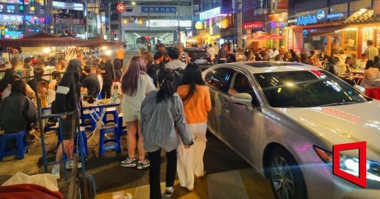 지난 12일 오후 9시께 찾은 서울 종로구 종로3가역 4번 출구 인근. 곳곳에서 ‘차 조심하라’는 고성이 들렸다. 인도에 펼쳐진 간이 테이블마다 남녀노소 할 것 없이 많은 이들이 삼삼오오 앉아 술을 마시고 있었다. 이들의 등 뒤로는 차들이 아슬아슬하게 지나다니고 있었다. 차량은 행인들과 테이블을 피하느라 중앙선을 넘어가며 아찔한 곡예 운전을 이어갔다. 시민 한지선씨(21)는 “거동이 불편한 노인들도 지나다니시던데 위험해 보인다”고 말했다. 현아영씨(21)도 “인스타그램에서 보고 분위기가 좋은 것 같아 찾아왔는데 이렇게 위험한 환경일 줄은 몰랐다”고 덧붙였다.