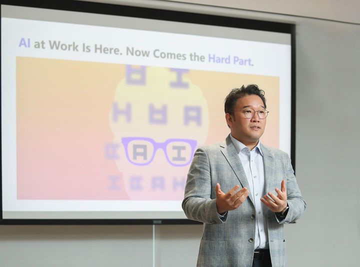 조원우 한국마이크로소프트 대표가 ‘업무동향지표 2024: AI가 여는 미래 일자리의 변화와 혁신’ 기자간담회에서 환영사를 통해 조직 내 AI 도입이 가지는 의미에 대해 설명하고 있다(사진=한국MS 제공) *재판매 및 DB 금지