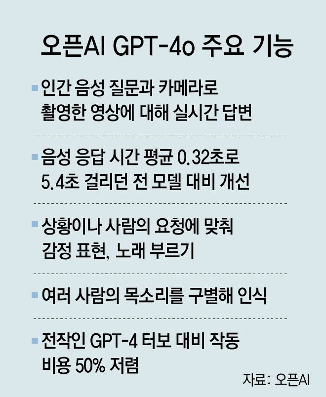 이날 GPT-4o를 공개한 오픈AI의 온라인 행사에서도 사람 같은 모습이 부각됐다. 가장 두드러진 점은 응답 속도다. 오픈AI는 GPT-4o의 응답 속도가 인간과 비슷한 수준인 평균 0.32초라고 밝혔다. 전작인 GPT-4의 반응속도는 평균 5.4초였다. 또 여러 화자의 목소리를 구별해 답변하거나 웃음, 노래, 감정 표출이 가능한 것도 차별점이다.