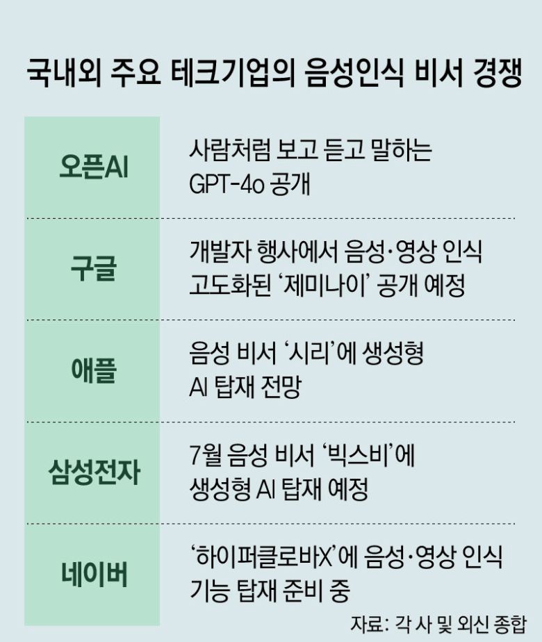 국내 기업들도 AI 음성비서 경쟁에 합류를 예고하고 있다. 한종희 삼성전자 디바이스경험(DX) 부문장(부회장)은 거대언어모델(LLM) 기반의 생성형 AI를 7월부터 음성비서 ‘빅스비’에 도입하겠다고 밝혔다. 지난해 자체 언어모델 ‘하이퍼클로바X’를 공개한 네이버도 음성 및 영상인식 기능을 탑재한 서비스를 준비 중이다.
