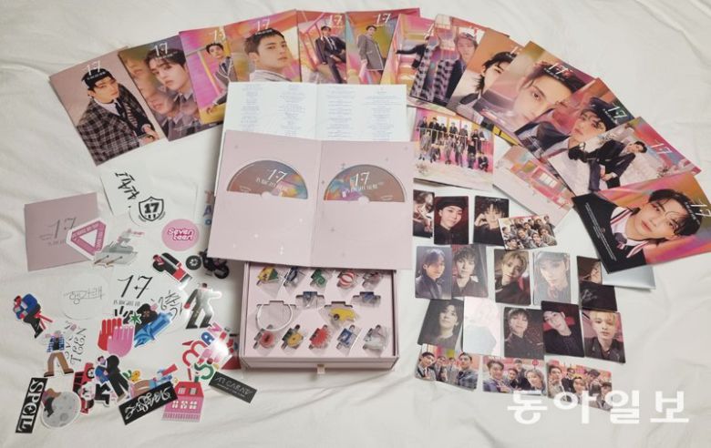 이런 가운데 음반을 더 비싸게, 더 많이 팔려고 하는 마케팅 기획은 점점 더 치밀해지고 있다. 예를 들어 지난달 29일 발매된 그룹 세븐틴의 베스트 앨범 ‘17 이즈 라이트 히어(17 IS RIGHT HERE)’는 CD 2장이 동일하게 들어 있지만 선물 구성품이 다른 앨범을 6종류로 나눠 판매하고 있다. 가장 저렴한 앨범인 ‘위버스 버전’(1만4500원)에 비해 구성품이 다양한 디럭스 버전(8만5800원)의 가격은 6배 가까이 된다. 앨범에 든 수록곡은 똑같지만, 버전마다 랜덤 포토카드의 종류와 굿즈가 다르다. ‘원하는 카드를 뽑을 확률’을 위해 더 지출하게 만드는 것. 랜덤 카드가 아닌 멤버 전원의 포토카드가 들어 있는 ‘안전한 선택’을 하려면 가장 비싼 디럭스 버전을 사야만 한다.