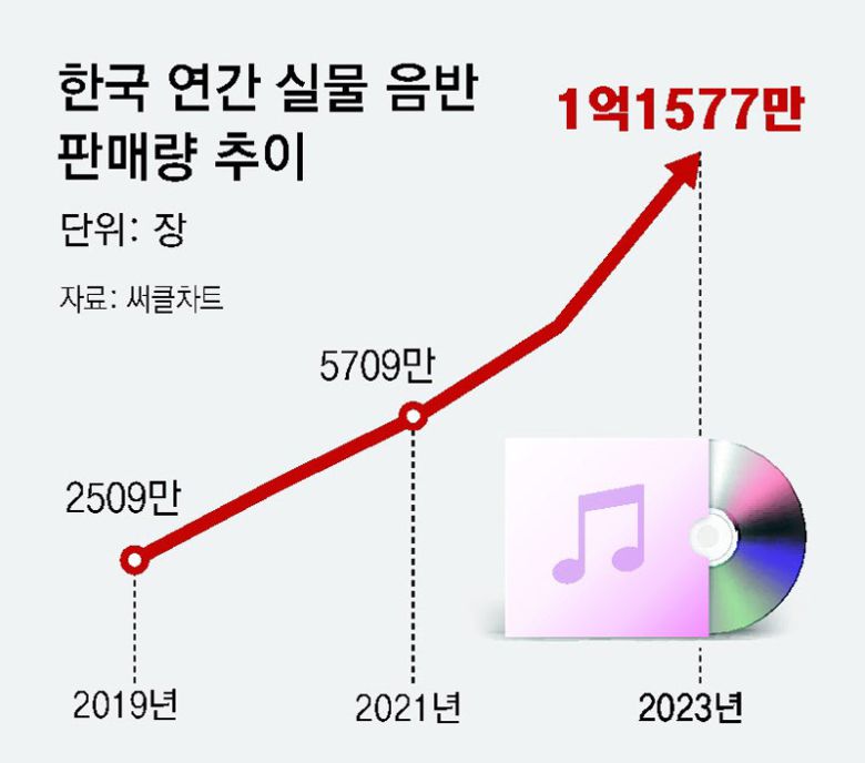 14일 써클차트에 따르면 지난해 한국 음반 판매량은 1억1577만 장으로 전년 대비 50% 급증했다. 국내 1위 기획사인 하이브의 전체 매출 중 음반·음원 비율은 2021년 30%에서 지난해 44.5%로 가파른 상승세다. 기획사 수익에서 음반 판매량이 차지하는 비중이 갈수록 높아지면서 전체 매출을 견인하고 있는 것이다.