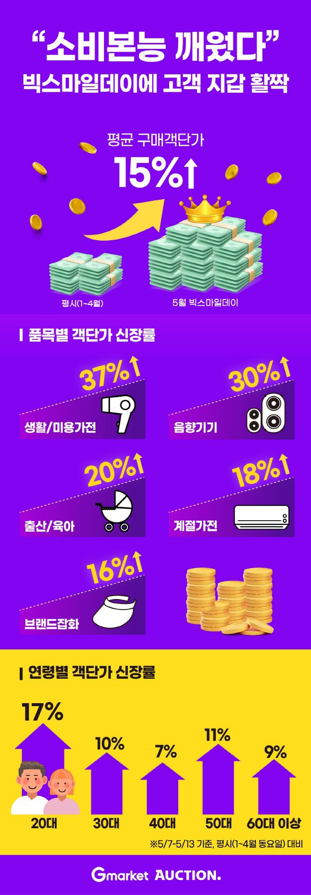 G마켓과 옥션이 지난 7일부터 진행하는 연중 최대 쇼핑축제 ‘빅스마일데이’ 판매데이터를 분석한 결과, 7일부터 13일까지 객단가(고객 1인당 평균 구매금액)는 평시(1~4월 동요일) 대비 15% 증가했다. 이는 지난해 5월 동요일보다 10%, 가정의 달을 앞두고 소비가 급증했던 4월보다 18% 높다.