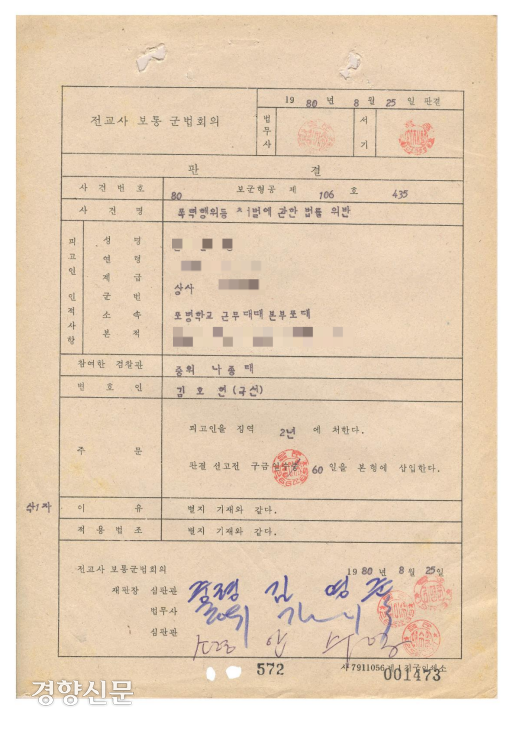 경향신문은 1980년 8월25일 진행된 A상사(당시 36세)의 ‘전교사(전투병과교육사령부) 보통 군법회의 판결문’을 최근 입수했다. 군사법원은 그날 ‘폭력행위 등 처벌에 관한 법률 위반(중상해)’으로 구속 기소된 포병학교 소속 A상사에게 징역 2년을 선고했다.
