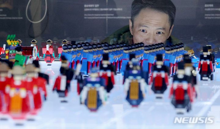 [서울=뉴시스] 김진아 기자 = 16일 서울 종로구 종묘 향대청 전시관 지오실에서 '레고' 작가 콜린 진이 본인의 작품인 '레고 오향친제반차도'를 보고 있다. 2024.05.16. bluesoda@newsis.com