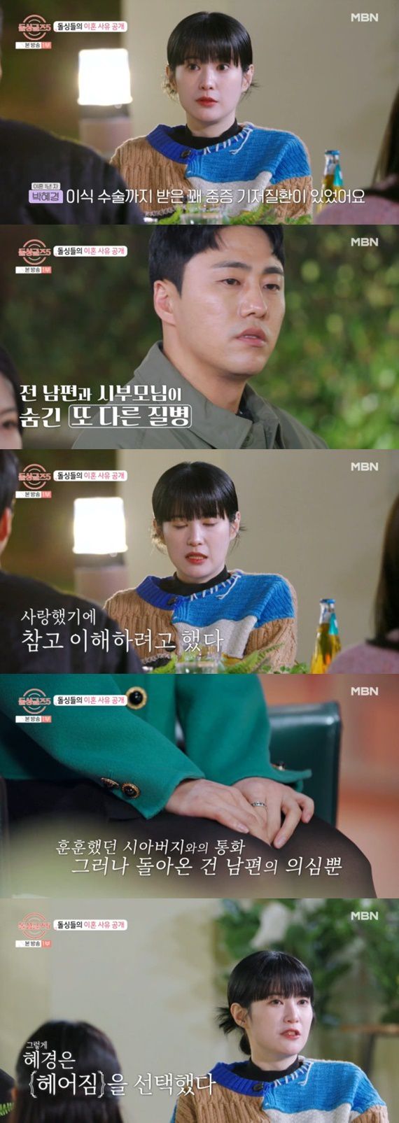 박혜경은 "결혼 전 연애를 시작할 때부터 (전남편에게) 기저질환이 있었다"라고 운을 뗐다. 박혜경은 전남편이 이식 수술까지 받은 중증 기저질환이 있는 걸 감수하고도 결혼을 선택했지만, 또 다른 질환을 숨긴 사실을 알게 됐다고. 박혜경은 "처음에는 말하기 힘들었다는 생각에 이해하고, 넘어가려 했지만, 저랑 우리 가족을 기만한 것들을 감당하기 힘들었다, 결혼이 목적 달성처럼 느껴졌다"라고 고백했다. 그러나 박혜경은 자신이 선택한 사람이기에 안고 가려고 했다고.