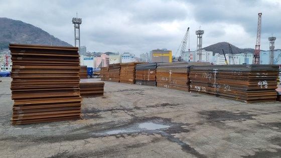 지난 4월 부산항에 중국산 후판이 쌓여 있다. 내수 침체를 겪고 있는 중국 철강사는 후판 등 주요 철강 제품의 가격을 낮춰 수출하고 있다. 국내 철강업계는 "중국산 제품으로 국내 가격이 왜곡되고 있다"고 말했다. 사진 독자제공 |
