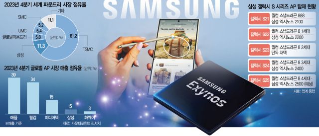 방점을 찍은 일은 2023년에 일어났다. 엑시노스 AP가 지난해 초 출시됐던 삼성 갤럭시 S23에 성능 문제로 단 하나의 칩도 탑재되지 못하며 자존심을 구긴 것이다. 올해 갤럭시 S24에 4나노 공정으로 만든 ‘엑시노스2400’을 공급하며 위상 회복에 나섰지만 지난해 4분기 스마트폰 AP 시장에서 5%의 점유율을 차지하는 등 칩 강자인 애플과 퀄컴에 여전히 밀리고 있다.