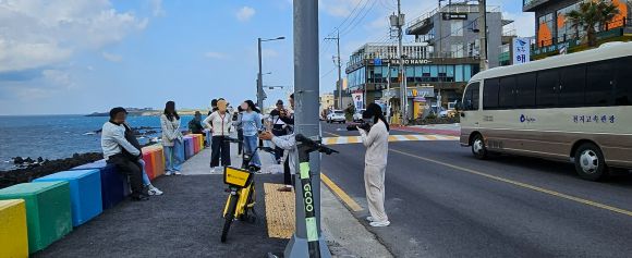 지난 15일 모처럼 화창한 부처님오신날. 도내 핫플(핫플레이스)중 하나인 제주시 도두동 무지개 해안도로는 아침부터 국내외 관광객들이 몰려와 인생샷을 찍느라 여념이 없었다.