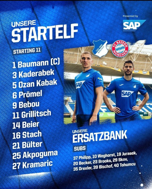 올리버 바우만이 골키퍼로 나서며, 오잔 카바크, 플로리안 그릴리치, 케빈 악포구마가 백3를 맡았다. 파벨 카데라벡, 그리샤 프뢰멜, 안톤 스타흐, 마리우스 벌터가 미드필더를 맡았다. 전방 스리톱은 안드레이 크라마리치, 막시밀리안 바이어, 일라스 베보우다.