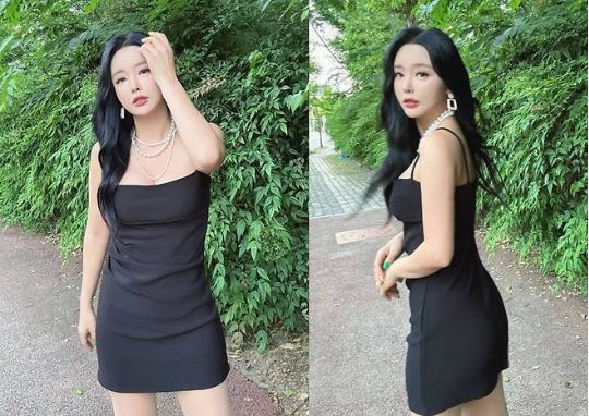 홍진영은 블랙 끈 미니원피스를 착용해 고혹적이면서도 세련된 패션 감각을 선보였다.사진=홍진영 SNS