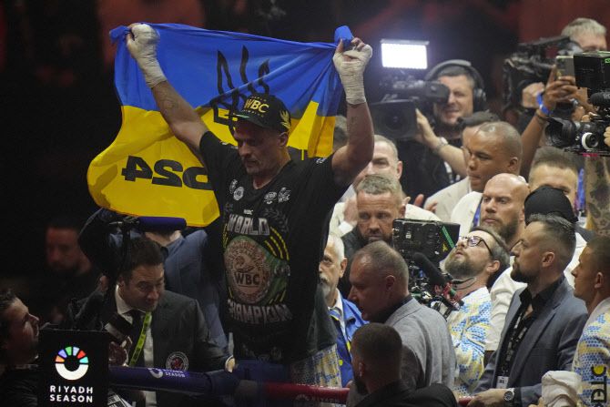 우크라이나 헤비급 복서 올렉산드르 우식이 타이슨 퓨리를 꺾고 세계 통합챔피언에 오른 뒤 우크라이나 국기를 들고 기뻐하고 있다. 사진=AP PHOTO