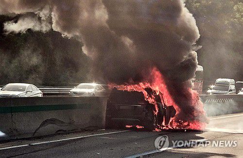 (서울=연합뉴스) 19일 오후 경부고속도로 상행선 청주휴게소 인근에서 발생한 추돌 사고로 카니발 승합차가 불타고 있다. 2024.5.19 [독자 제공. 재판매 및 DB금지]