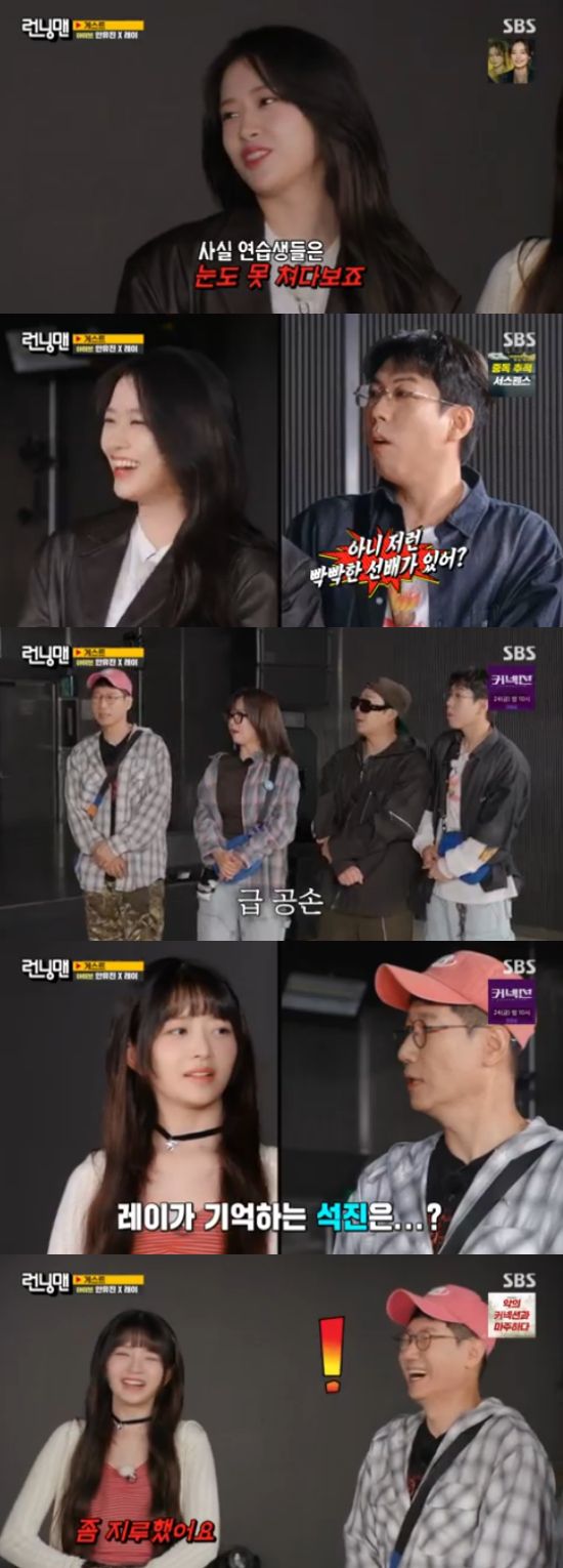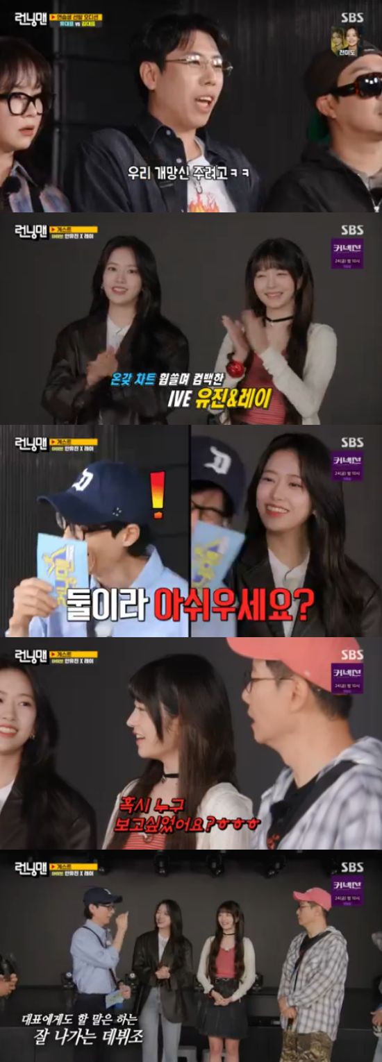 '런닝맨' 멤버들은 안유진과 레이에게 "이미 데뷔를 하시지 않았냐. 그럼 저희가 선배님이라고 불러야하는 거냐"고 했고, 안유진은 "사실 연습생들은 눈도 못 쳐다본다"고 선배 포스를 보여줬다.