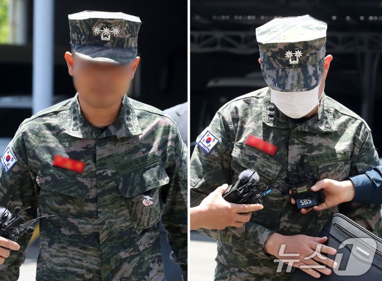 해병대 1사단 포병 7여단장(왼쪽)과 11대대장이 19일 오후 '해병대 채 상병 순직 사건' 관련 경찰의 대질조사를 받기 위해 각각 경북 경산시 경북경찰청 형사기동대에 출석하고 있다. 2024.5.19/뉴스1 ⓒ News1 공정식 기자 |
