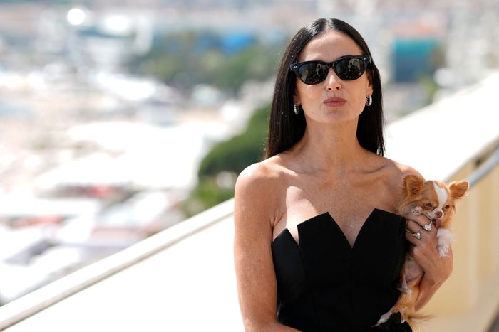 영화 ‘The Substance’로 올해 제77회 칸영화제에 진출한 배우 데미 무어. 그녀는 19일(현지시각) 자신의 강아지의 함께 칸을 찾은 외신 기자들 앞에 섰습니다. [AFP·연합뉴스] |