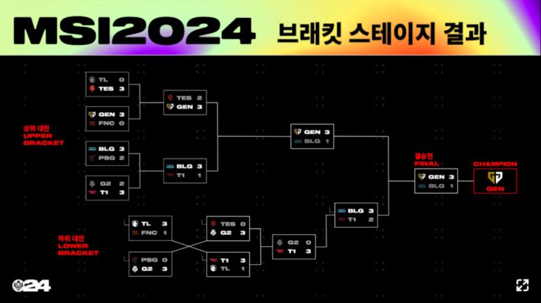 '리그 오브 레전드(LoL)' 이스포츠의 한국 프로 리그를 주최하는 리그 오브 레전드 챔피언스 코리아(대표: 오상헌, 이하 LCK)는 19일(일) 중국 청두에 위치한 청두 파이낸셜 시티 공연 예술 센터(Chengdu Financial City Performing Arts Center)에서 열린 2024 미드시즌 인비테이셔널(Mid-Season Invitational; MSI) 결승전에서 젠지가 빌리빌리 게이밍(BLG)을 세트 스코어 3대1로 물리치고 정상에 올랐다고 밝혔다.