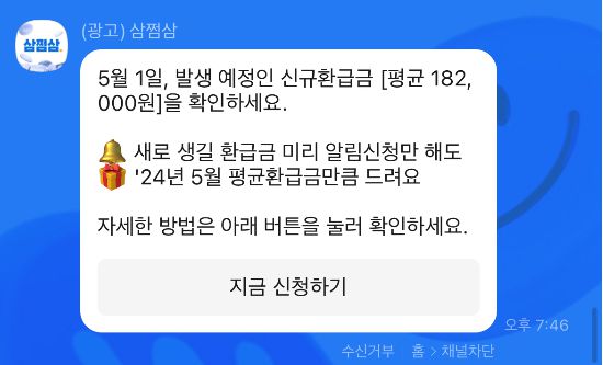 삼쩜삼이 SNS 등을 통해 환급을 제안하는 화면. (출처=삼쩜삼 카카오톡 캡처) |