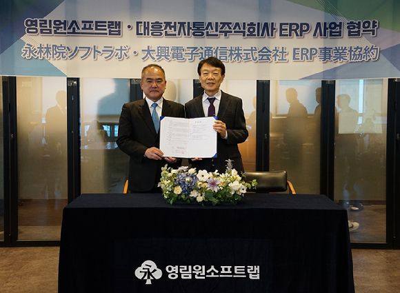 마쯔야마 고이치로 대흥전자통신주식회사 대표(왼쪽)와 권영범 영림원소프트랩 대표가 업무협약을 맺은 뒤 기념촬영을 하고 있다. [사진=영림원소프트랩]