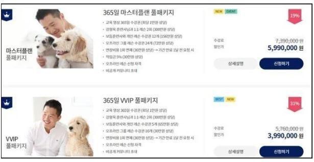 사진에서 보듬컴퍼니 '365일 마스터플랜 풀 패키지'는 정가 739만원으로, 할인된 가격이 599만원이었다. 이밖에 △교육 영상 365일 수강권 △강형욱 훈련사와 1:1 레슨 2회(300만원 상당) △보듬훈련사와 개인 레슨 수강권 12개(156만원 상당) △오프라인 그룹 레슨 수강권 24개(72만원 상당) 등이 있다.