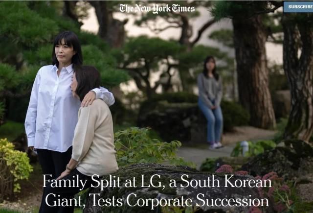 고 구본무 선대회장의 장녀 구연경 대표(왼쪽)가 엄마인 김영식 여사의 어깨에 손을 올리고 있는 장면. 오른쪽에 흐릿하게 보이는 이가 선대회장 차녀 구연수씨. [사진=뉴욕타임스 홈페이지 캡처] |