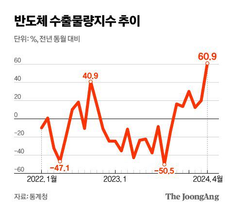 BSI 전망치는 2022년 4월(99.1)부터 27개월 연속 기준선인 100을 밑돌고 있다. 눈에 띄는 것은 반도체 등을 포함한 전자·통신장비 수치다. 6월 전자·통신장비 BSI는 105.9로, 2022년 10월 이후 21개월 만에 기준선을 넘으며 반등했다. 전자·통신장비 경기는 좋아질 것으로 내다본다는 의미다.