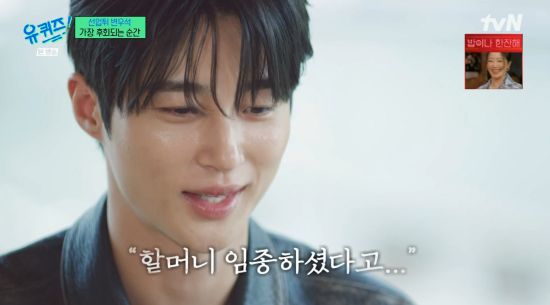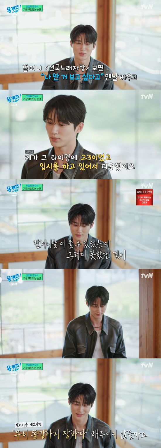 변우석은 "제 인생에서 가장 후회되는 순간은 사실 더 볼 수 있고 같은 공간에 있을 수 있었는데 그러지 못하고 약간의 편함을 위해서 그런 선택을 했던 순간이 사실 저한테는 가장 후회되는 순간인 거 같다. 전 지금도 제 곁에 할머니가 있다고 생각한다. 제가 운이 진짜 좋다. 무슨 일을 해도"라며 끝내 눈시울을 붉혔다.