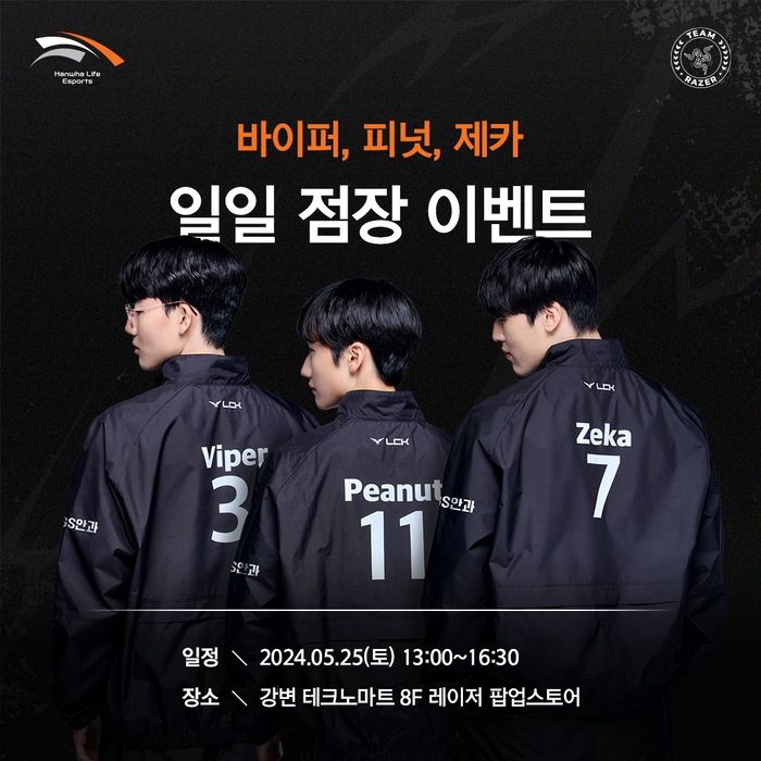 레이저(RAZER)는 오는 25일 강변 테크노마트 내 레이저숍에서 한화생명 소속 ‘바이퍼’, ‘피넛’, ‘제카’ 선수들의 일일 점장 이벤트를 진행한다고 밝혔다.