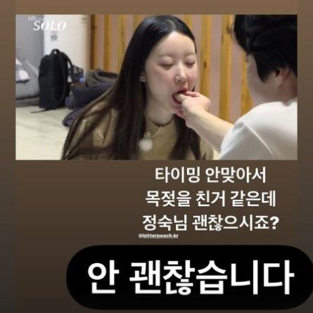 23일 20기 정숙은 개인 채널에 "안 괜찮습니다"라는 문구와 함께 영호의 게시물을 업로드했다. 방송 화면을 캡처해서 올린 영호의 "타이밍 안 맞아서 목젖을 친 거 같은데, 정숙님 괜찮으시죠?"라는 말에 유쾌하게 반응한 것.