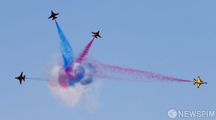 [서울=뉴스핌] 정일구 기자 = 16일 경기 성남시 서울공항에서 열린 국내 최대 항공우주·방위산업 전시회 '서울 아덱스(ADEX) 2023' 프레스 데이에서 대한민국 공군 블랙이글스가 축하 비행을 하고 있다. 2023.10.16 mironj19@newspim.com |