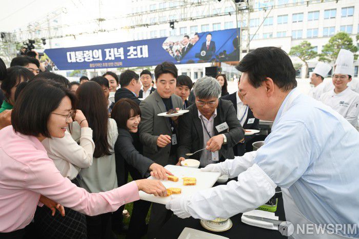 [서울=뉴스핌] 윤석열 대통령이 24일 서울 용산구 대통령실 잔디마당에서 열린 출입기자단 초청 만찬 간담회에서 기자단에 계란말이를 배식하고 있다. [사진=대통령실]2024.05.24 photo@newspim.com
