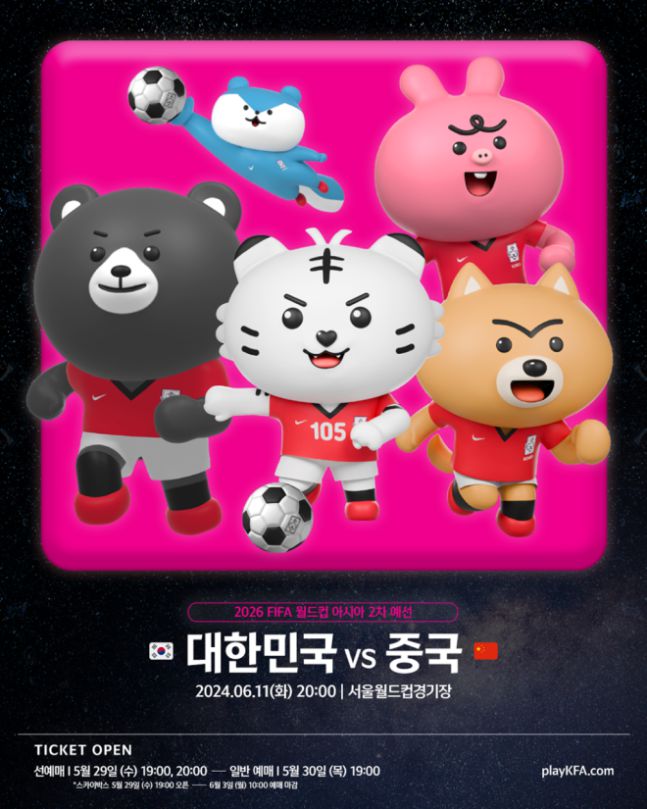 대한축구협회는 "2026 북중미 월드컵 아시아 2차 예선 중국과의 홈 경기 티켓을 29일부터 순차적으로 판매한다"고 밝혔다.