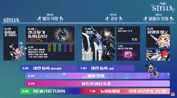 이 회사는 우선 내달 26일 '스텔라 별의 여정' 업데이트를 선보인다. 이후 7월 24일에는 새 메인 캐릭터 '검성' 등을 공개한다. 또 8월 24일에는 '별들의 전쟁'을 통해 고레벨 타깃의 콘텐츠를 추가한다는 계획이다.