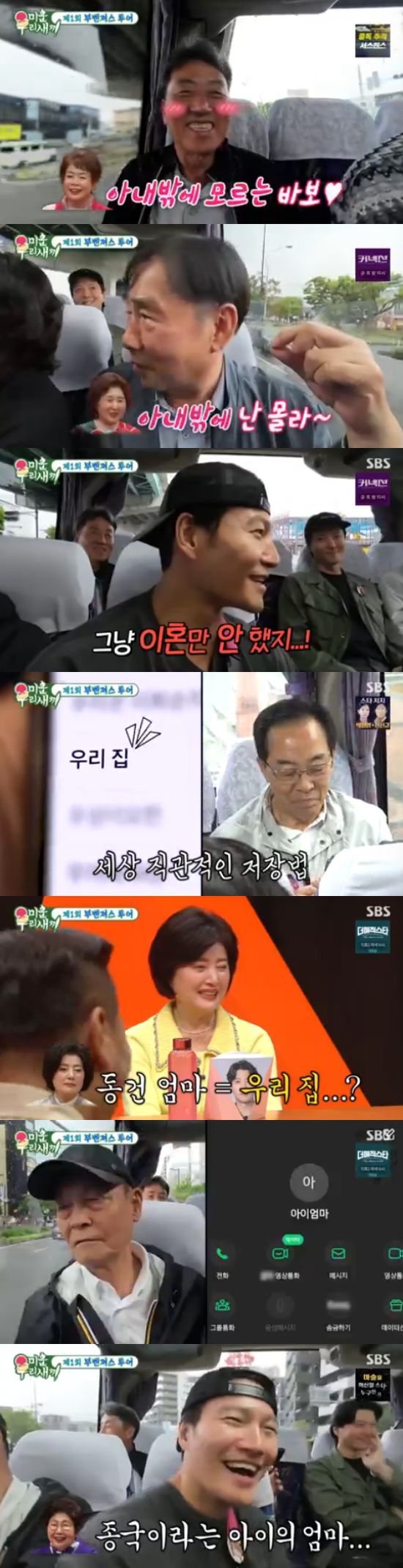 김희철 아버지와는 달리 김종국의 아버지는 아내를 '아이 엄마'로 저장을 했고, 이동건의 아버지는 '우리 집'으로 저장해 뒀다. 이를 본 김종국의 어머니는 "그래도 '우리 집' 보다는 '아이 엄마'가 나은 것 같다"고 말해 웃음을 자아냈다.