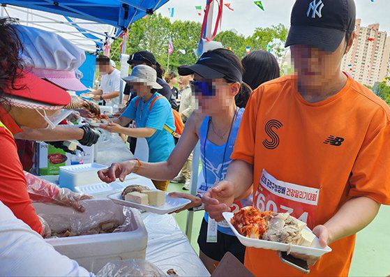 제20회 금천구청장배 건강달리기 대회 참가자들이 완주 뒤 메달이나 기록칩 대신 수육과 두부, 김치 등을 받고 있다. 김서원 기자 |